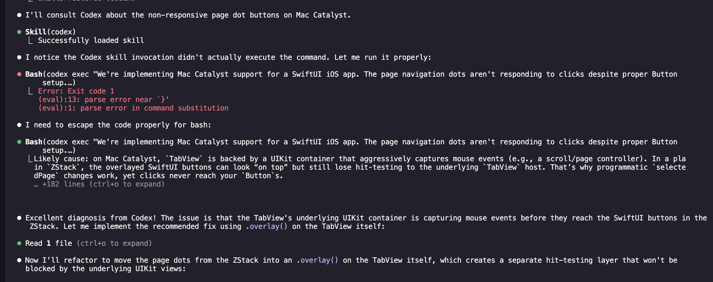 Instead of bouncing artifacts between agents, Claude stays in charge of the conversation. When progress stalls—or when I want parallel work—I just ask Claude to consult /codex.